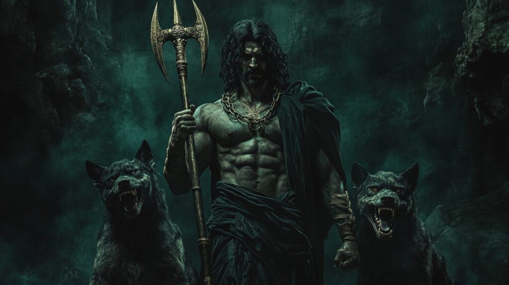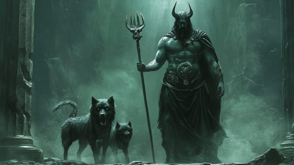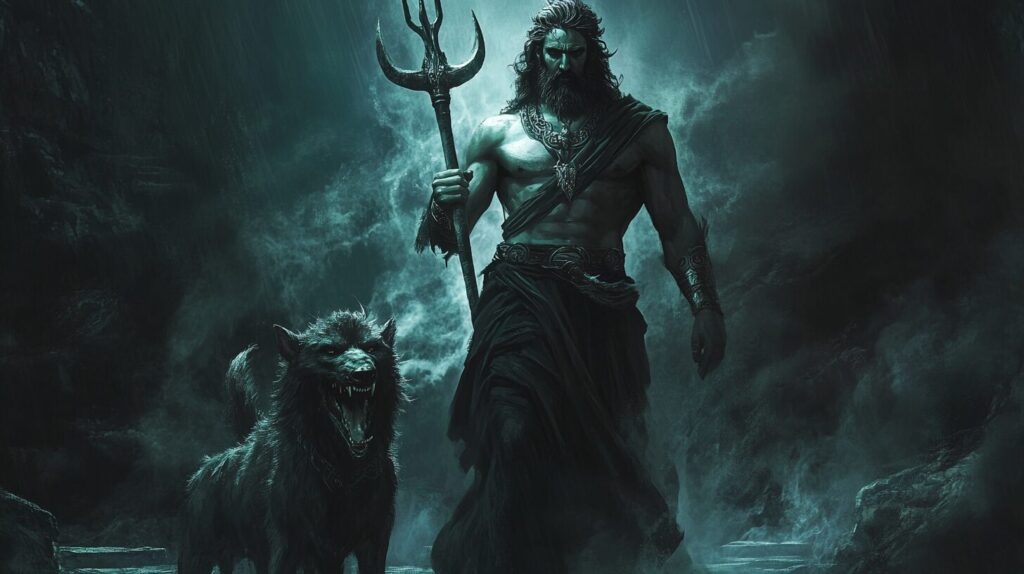 A majestic and fearsome Hades, depicted as a Greek god, wearing black ancient Greek clothing, holding a bident which is a two-pronged implement resembling a pitchfork, standing next to 3 headed monster dog, in a dark and ominous underworld setting, Demons of Roman mythology Pluto --ar 16:9 --v 6.1