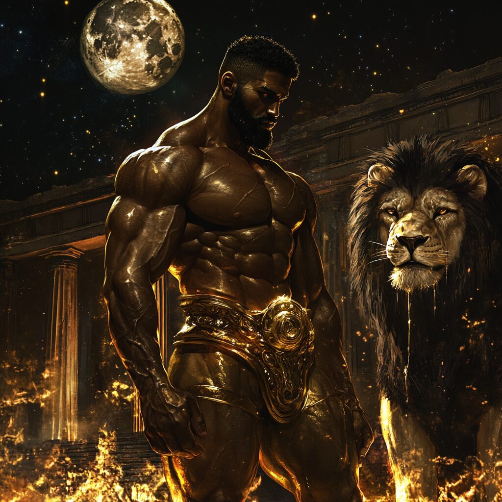 realistic style mystery style, a huge black greek male muscle god, huge mega beautiful muscle god, ultra huge vascular muscles, short hair, dressed in tight gold clothes, with a gold and black fur lion, in front of the temple of athens, full moon night, starry night, pink flames, gold dust, sweating gold water, Demons of Roman mythology Pluto --v 6.1