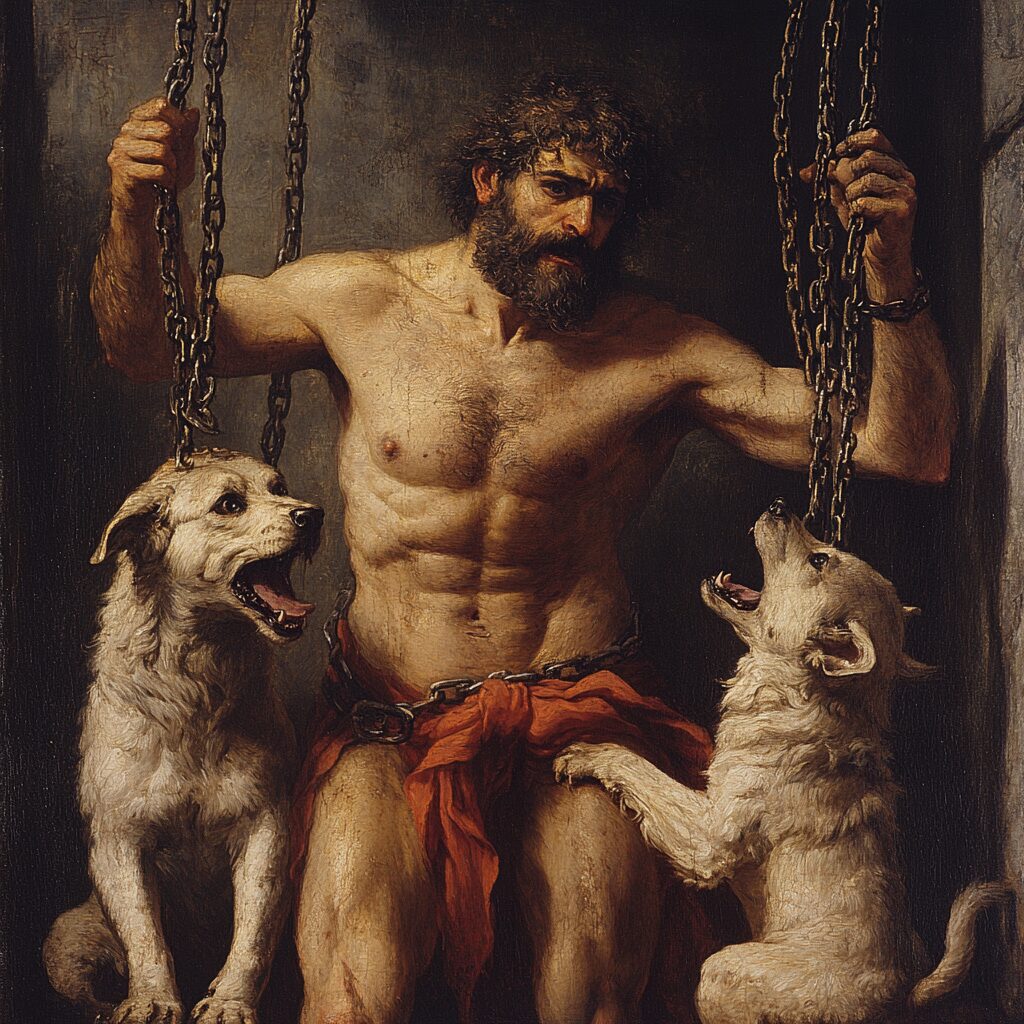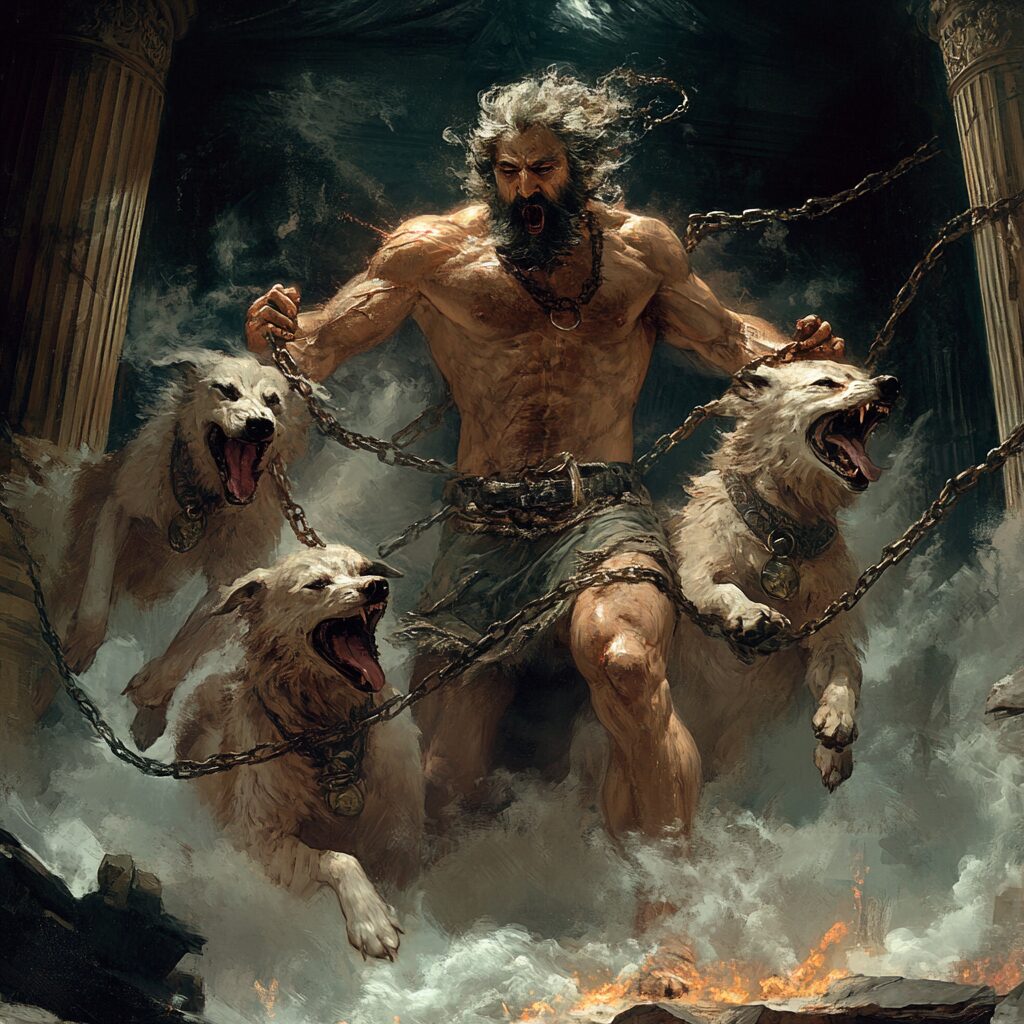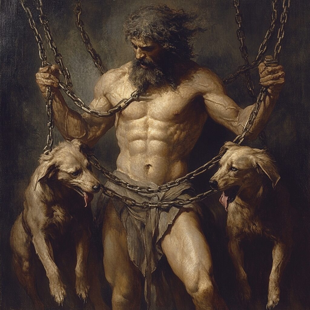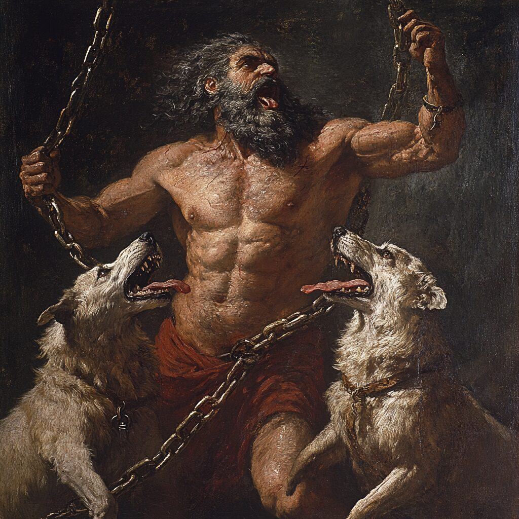 mythological god holding his three dogs with chains. His torso is uncovered and the dogs are attacking, Demons of Roman mythology Pluto --v 6.1