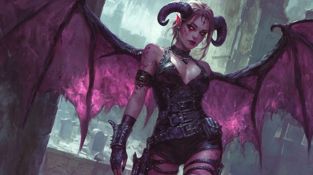 Grimoire devils Marbas, a hybrid pixie-tiefling with tattered wings, ram horns, she has a red demon colored skin, purple wings, she is a female necromancer, leather leggings with lots of straps and buckles, sleeveless vest with studs and spikes, she is in a graveyard, artgerm, dnd --ar 16:9 --v 6.1