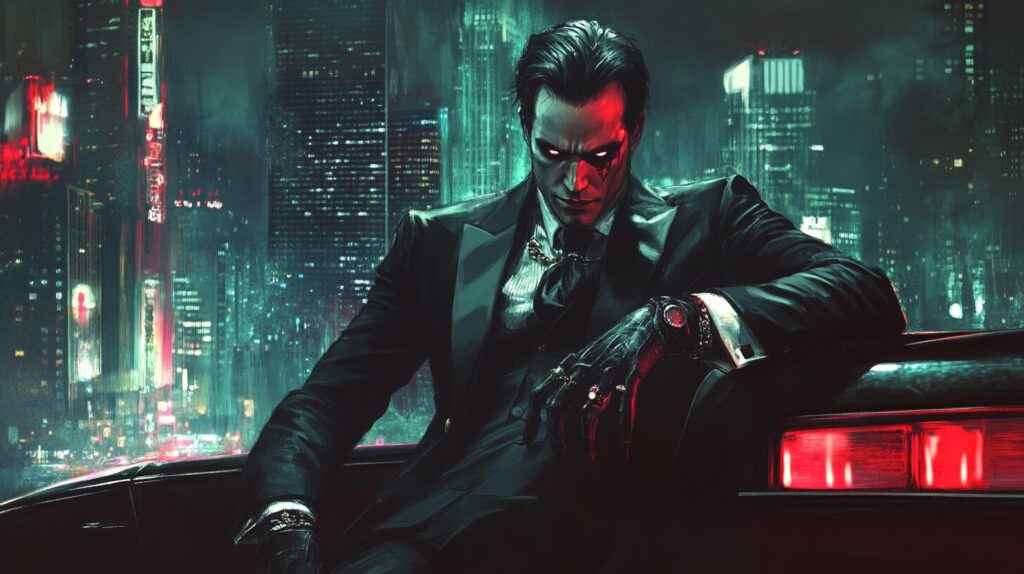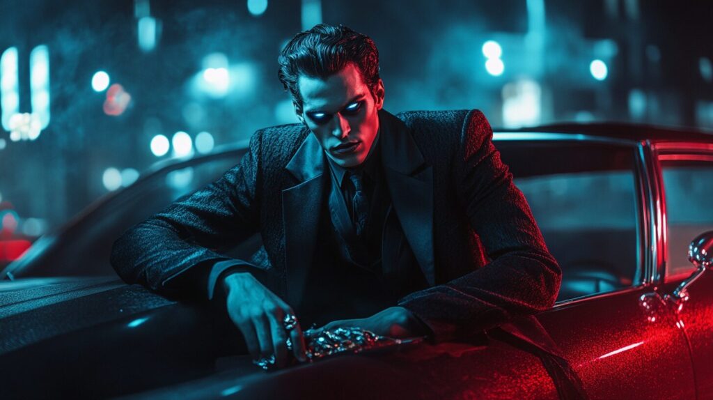 A modern interpretation of Mephistopheles, dressed in a sharp suit, leaning on a luxurious car, city lights reflecting in his eyes, urban noir atmosphere. --ar 16:9 --v 6.1