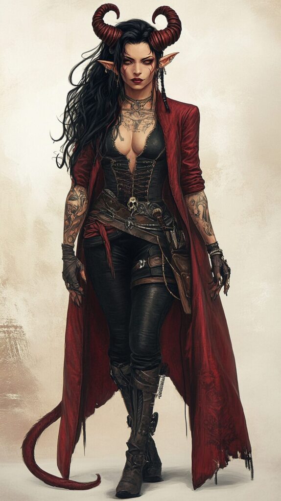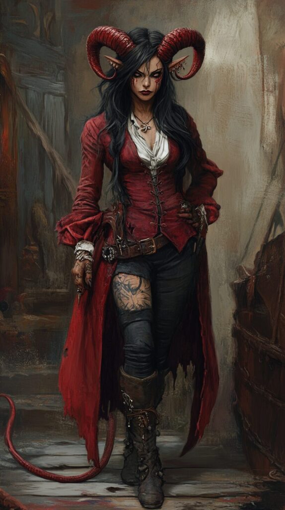 Grimoire devils Marbas, hyper realistic, stylized, fantasy, pirate, corsair, female, full body, overcoat red tiefling, long black hair, tattoos, curled horns, tail --ar 9:16 --v 6.1