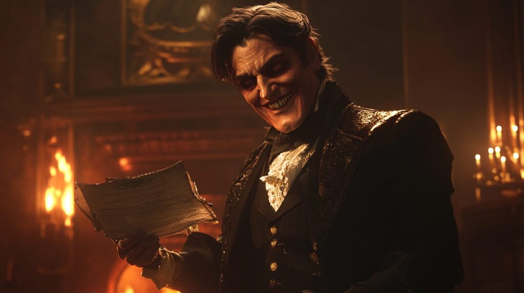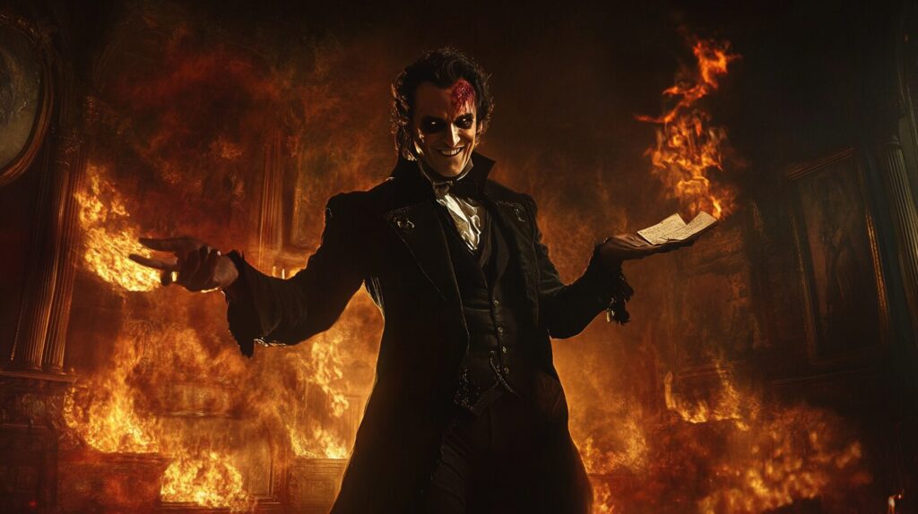 A Victorian-era Mephistopheles in an elegant black suit, holding a contract in one hand, a sinister grin on his face, flames subtly flickering in the background, cinematic lighting. --ar 16:9 --v 6.1