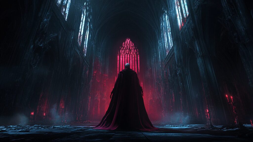 A dark and twisted depiction of Mephistopheles, standing in a gothic cathedral, his eyes glowing red, surrounded by shadows and ominous symbols, highly detailed, 4k resolution --ar 16:9 --v 6.1