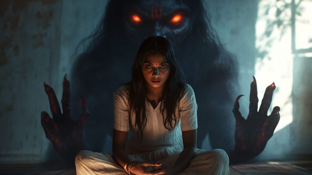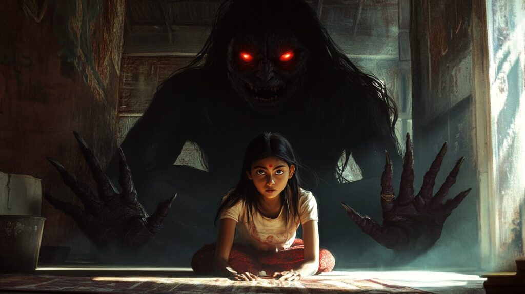 beautiful indian girl sitting in room right behind a massive Drakula shadow with scary glowing red eyes and expanded scary hands. --ar 16:9 --v 6.1
