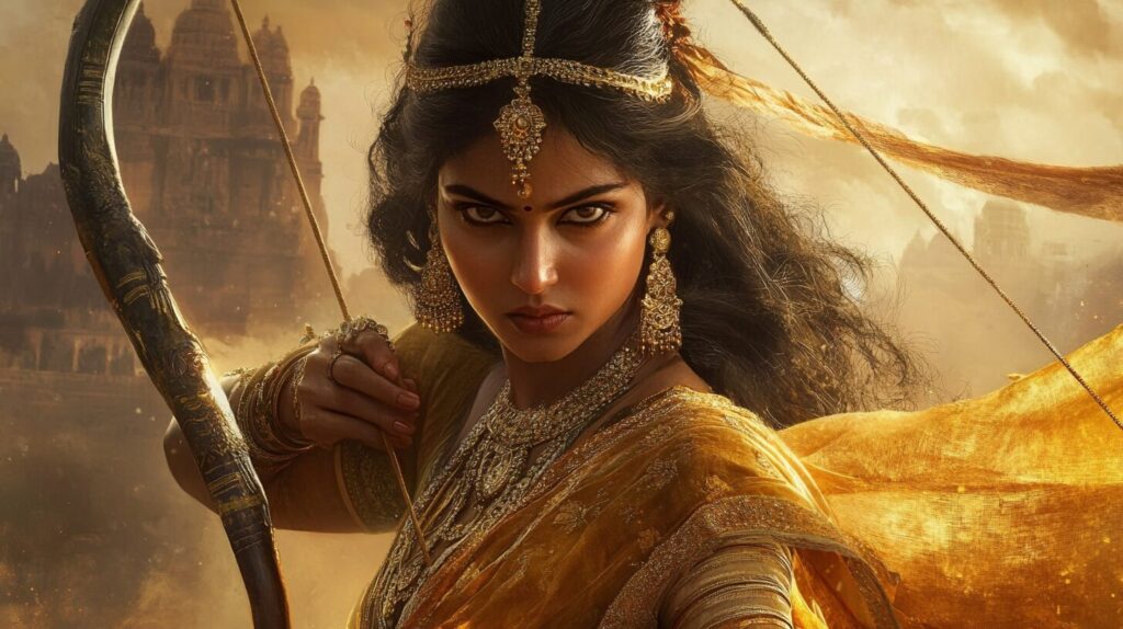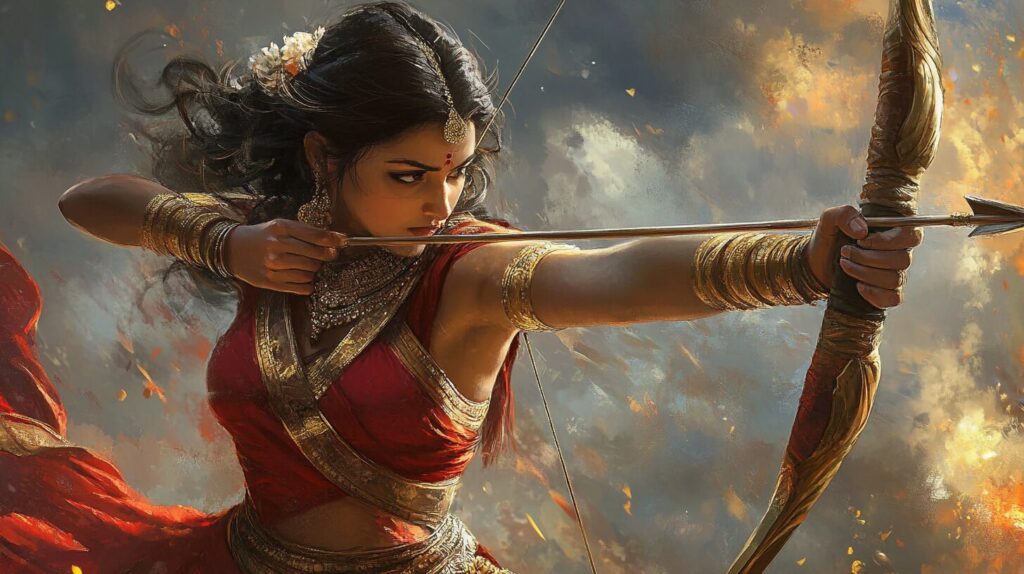 Chitrangada, the warrior princess of Manipura in the Hindu epic Mahabharata was the only heir of King Chitravahana, and the third wife of Arjuna. She ìwas well-versed in warfare and acquired the skills to protect the people of her --ar 16:9 --v 6.1