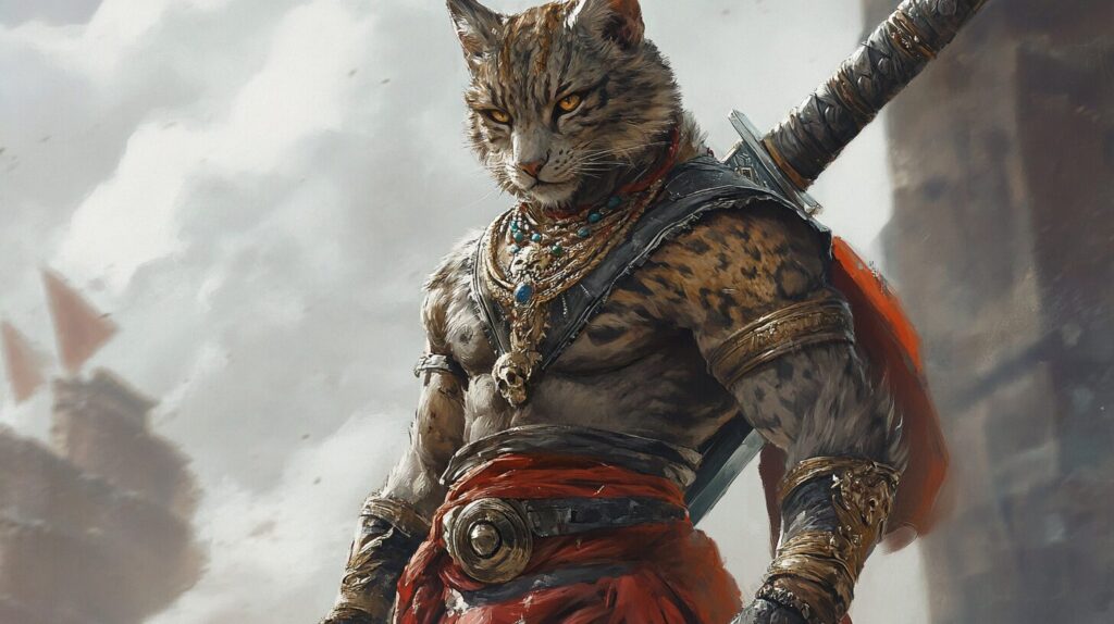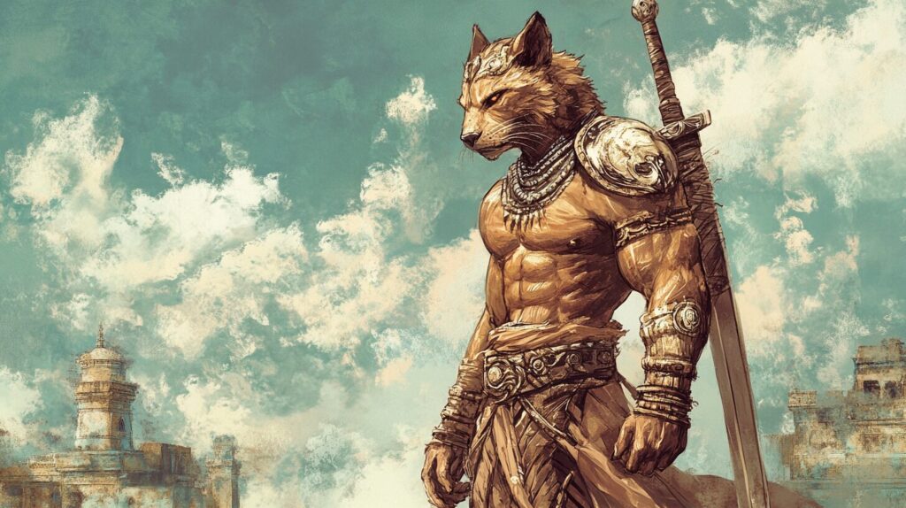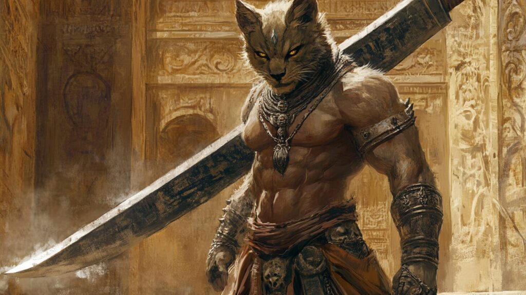 male muscular khajiit royal guard with a greatsword sheathed on his back, indian vibes, illustration, final fantasy xii bhujerba --ar 16:9 --v 6.1