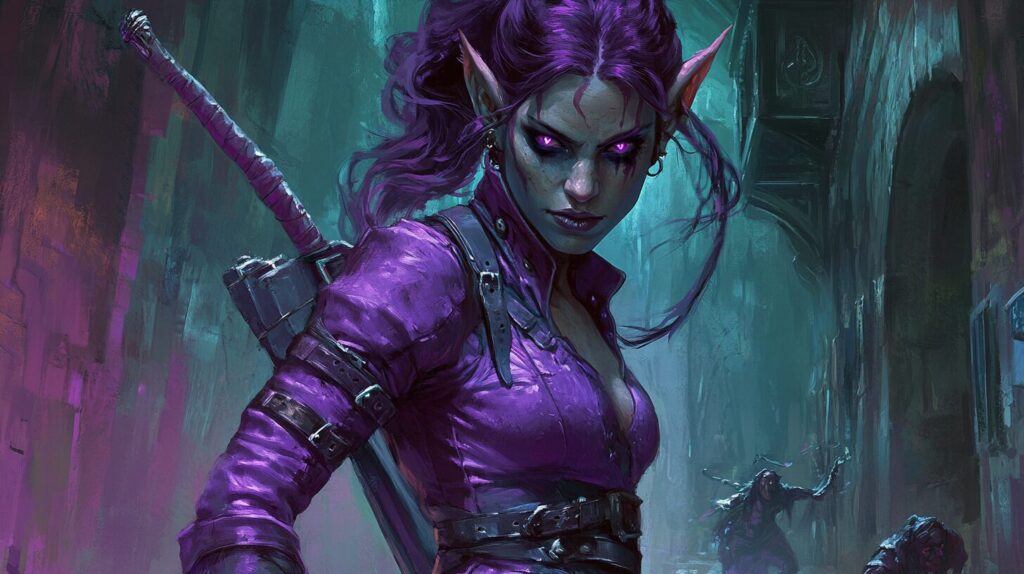 a tiefling woman named River Crime. advenurer woman in purple tattered leather clothes --ar 16:9 --v 6.1