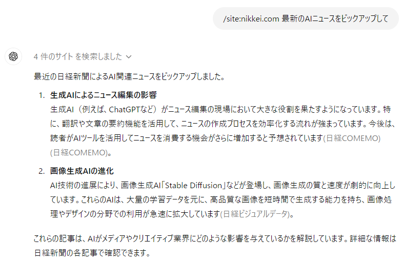 もっと簡単に、ChatGPTに最新ニュースをまとめさせたい人は以下のように指示すると良いです。たとえば日経を指示すると一瞬で最新のAIニュースをピックアップしてくれます。指定したドメイン内だけですが簡単で便利です。