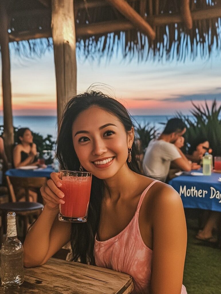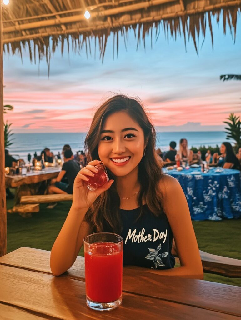 Orange sunset on the ocean horizon, A photo of an beautyful Asian woman sitting at a table with her hand on top, in front and drinking red juice from a glass next to it. She is smiling happily. The background shows people relaxing outdoors under wooden structures at night. On one side there's green grass. In another part you can see some tables covered in a blue cloth that has "MotherDay" written on them. It also says 'The Edmondson' name written in white letters on their t-shirts. There is no lighting in this scene. --ar 3:4 --style raw --v 6.1