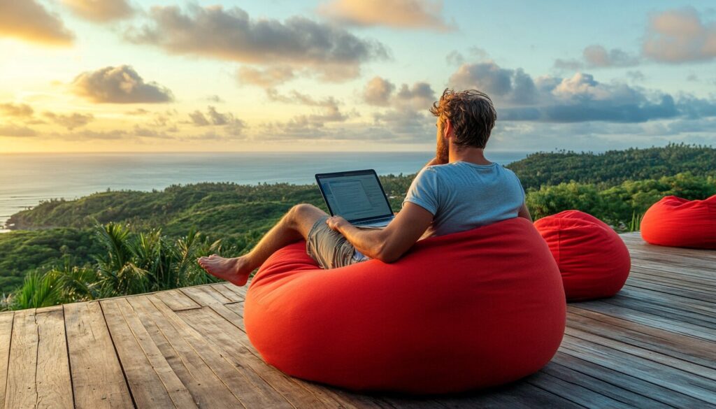 sunset and seascape at sunset, A hyper-realistic photo of a man working on his laptop while sitting on a large, bright red bean bag on a wooden deck with a stunning panoramic view of a tropical landscape. The man, casually dressed in a light t-shirt and shorts, is deeply focused on his work, with his elbow resting on his knee and his hand supporting his chin. The deck is adorned with several other red bean bags, creating a relaxed, comfortable atmosphere. The background reveals a breathtaking view of lush green hills, a distant coastline, and the calm, turquoise waters of the ocean. The scene perfectly captures the balance of productivity and relaxation in an exotic, serene environment, highlighting the freedom and flexibility of remote work." --ar 7:4 --v 6.1