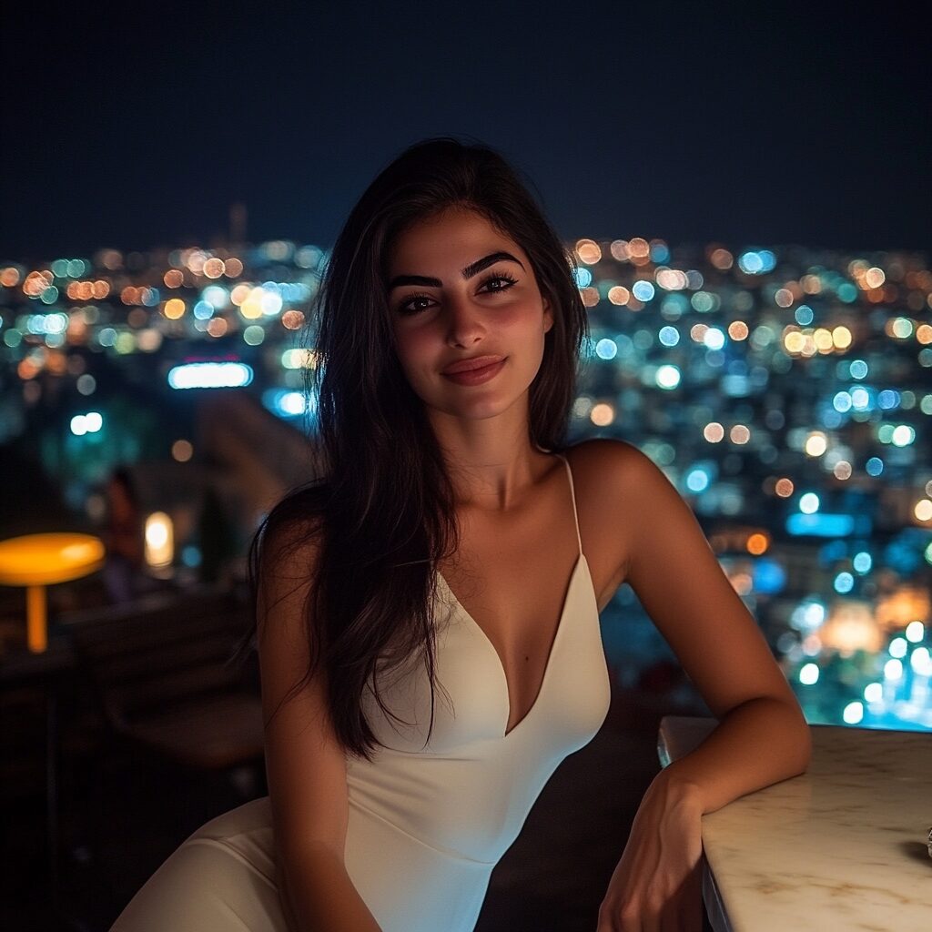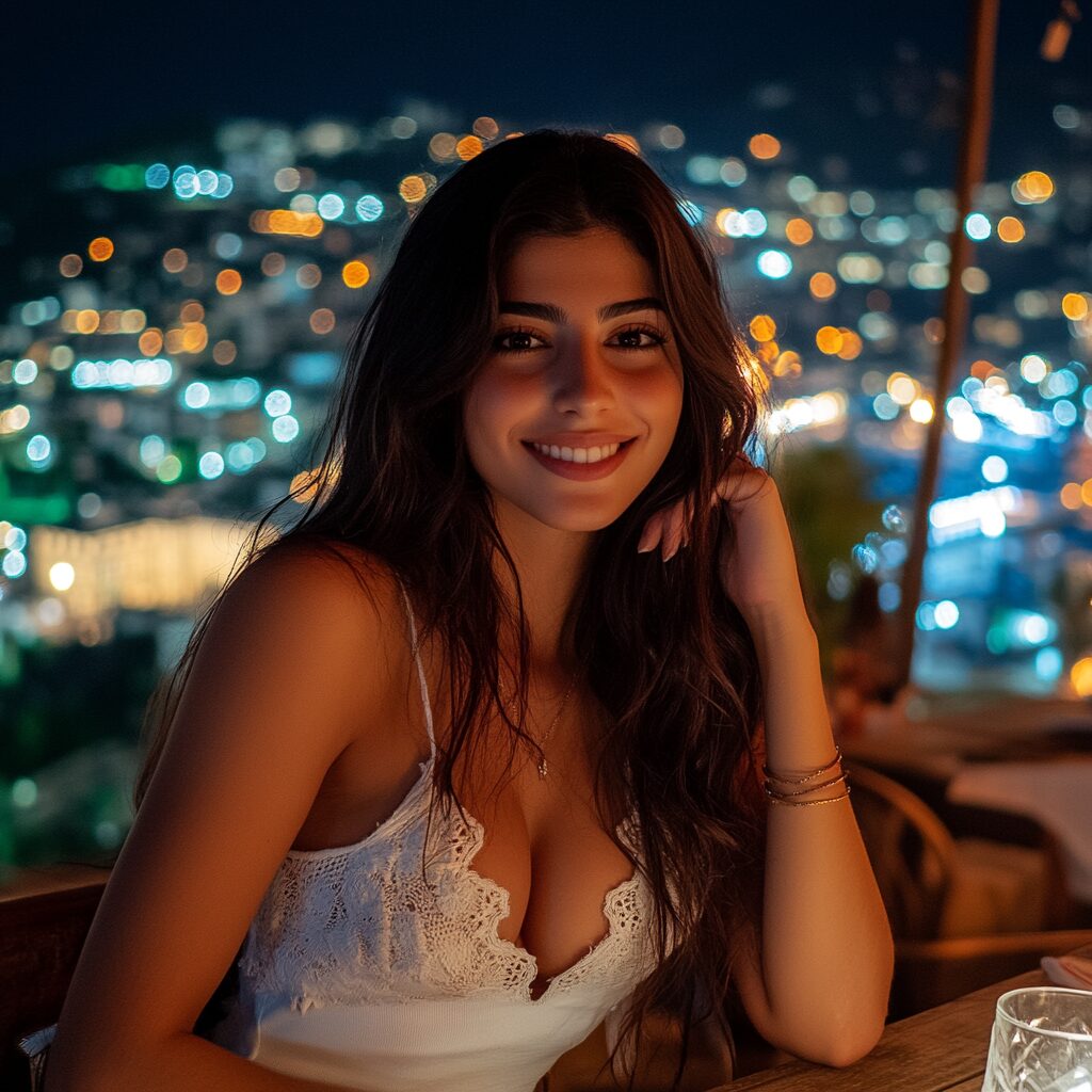 A photo of an extremely beautiful lebanese woman wearing white dress, posing at the bar in restaurant on top of mount Ibrach with her legs crossed and hands resting behind head while smiling for camera. She has long dark hair and tan skin, night time with city lights in clear background. Her face is illuminated by the soft glow from the neon signs. The scene captures a sense of adventure and excitement as she takes a break during their journey to lebanon most scenic spot --v 6.1