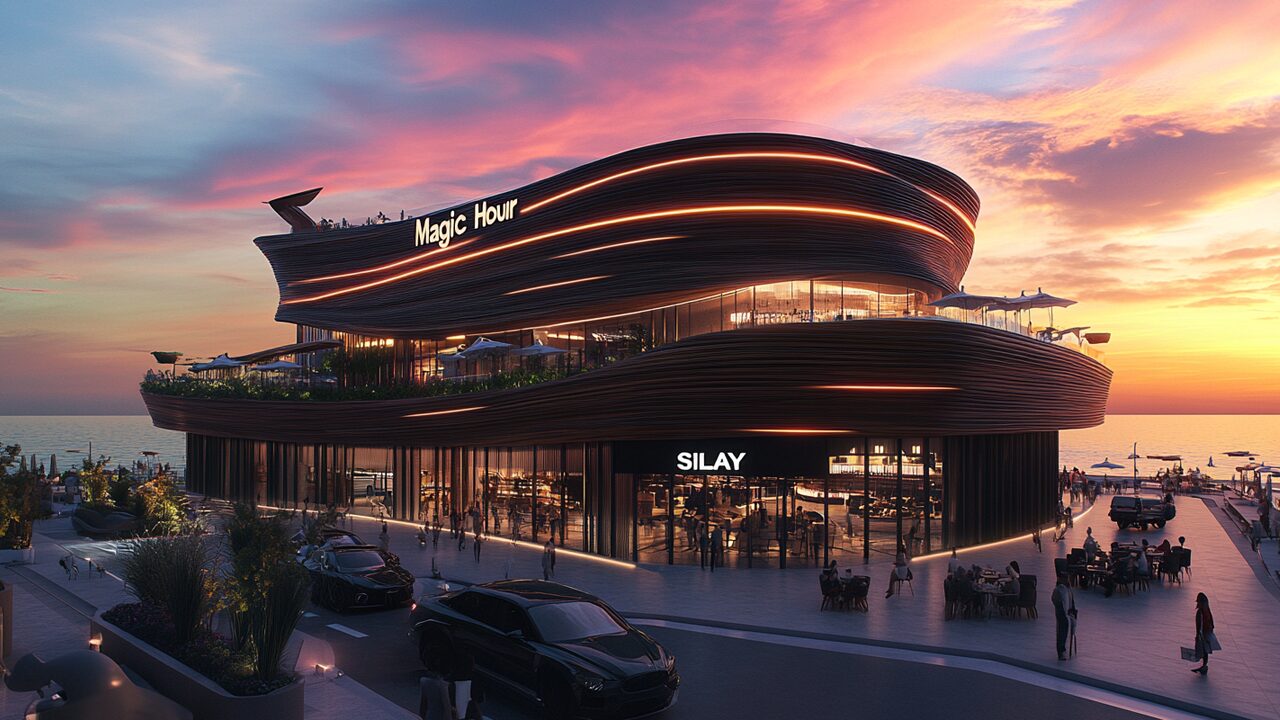 sunset and seascape at sunset, exterior photography showing in front car parking and entrance to a 2 story U-lay out outdoor shopping mall 35 by 72 meters curvilinear wooden structure in the style of zaha located on the top roof terrace at a building complex signage "SILAY" philippines The mall has few green features while suspended glass canals cross over terraces creating vertical gardens. People eating outside a cafe under sunshades luxury archdaily --ar 128:71 --style raw --v 6.1