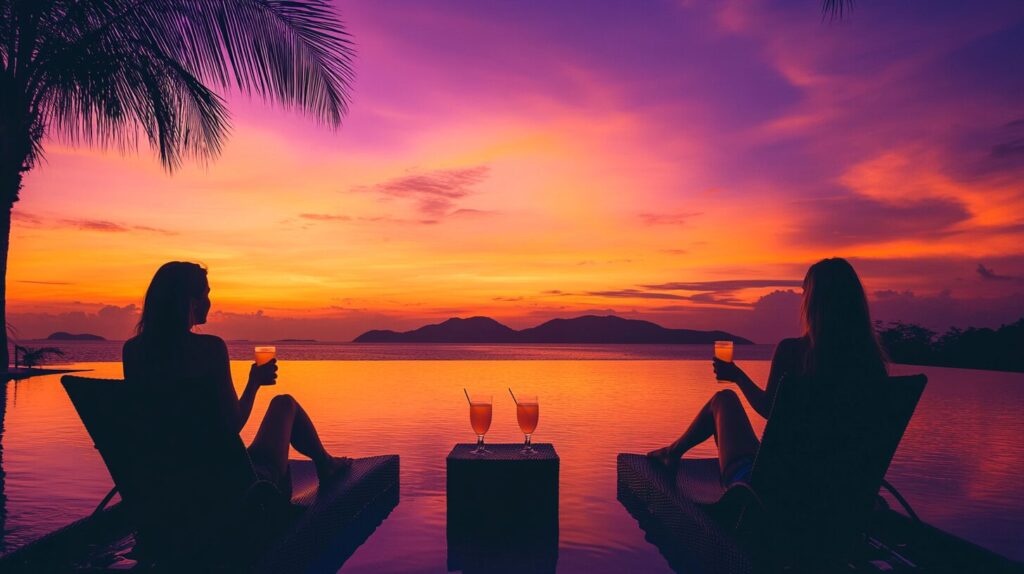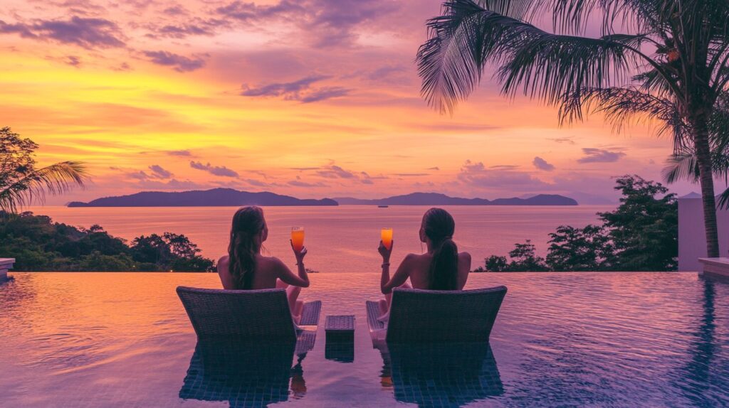 Beautiful orange and purple sky, Two women are drinking fruit juice by the pool of a Phuket hotel in Thailand. They are sitting on beach chairs. You can see the beautiful sea and palm trees in front of you. --ar 16:9 --v 6.1