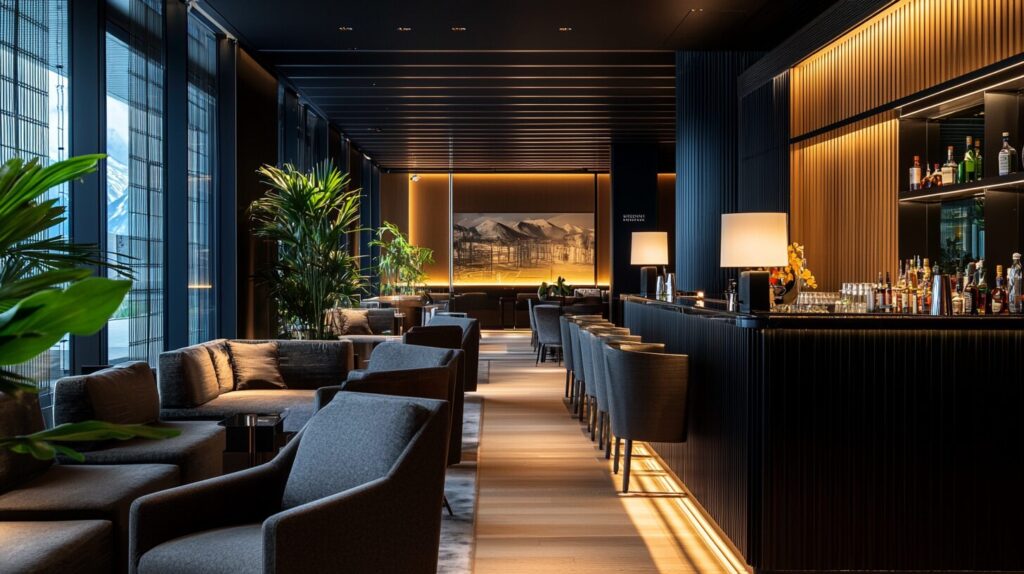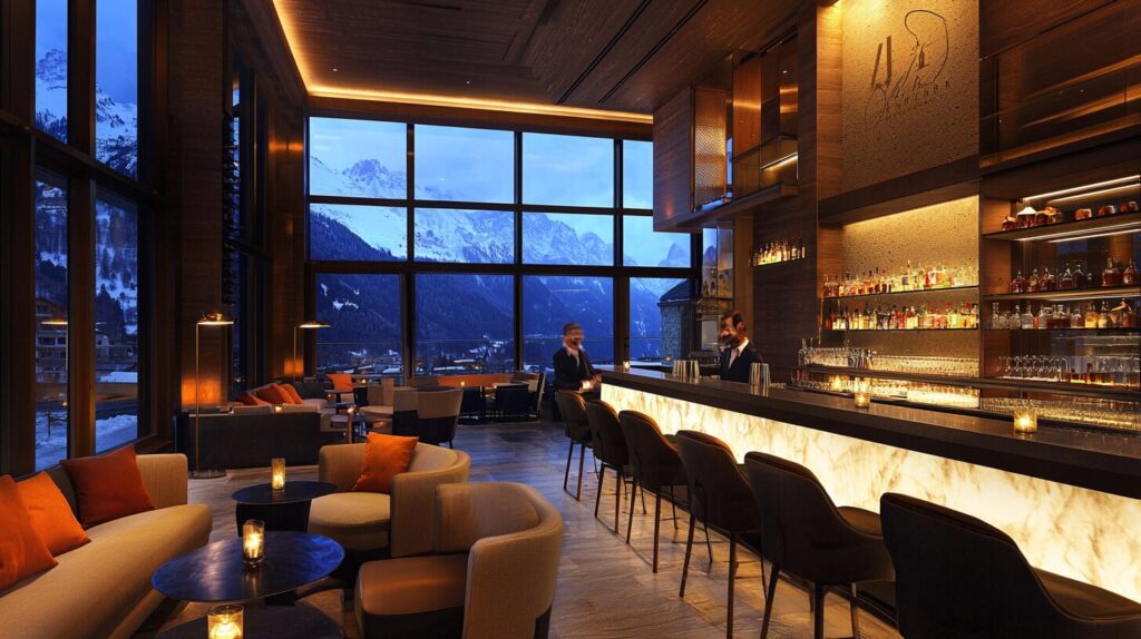 A sophisticated and exclusive bar lounge featuring stylish, modern decor with plush seating and ambient lighting. A skilled bartender is behind the bar, expertly preparing luxury cocktails. The bar offers a wide selection of premium spirits, fine wines, champagnes, and crafted cocktails. Guests are seated in a relaxed, elegant atmosphere, enjoying their drinks while live music plays softly in the background. Large windows provide breathtaking panoramic views of the Swiss Alps, adding to the luxurious experience. The scene exudes a sense of exclusivity, refinement, and indulgence, perfect for a high-end evening out. --ar 16:9 --quality 2 --v 6.1
