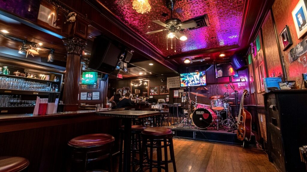 Beautiful orange and purple sky, real photo, female behind a bar working, college night, club theme, lots of lights, western club theme , perfect body figure, super big eyes, dress, smile, sweet, real skin, long hair, modern western country, background in night club,low camera quality phone photo, photo taken from phone, --ar 16:9 --v 6.1