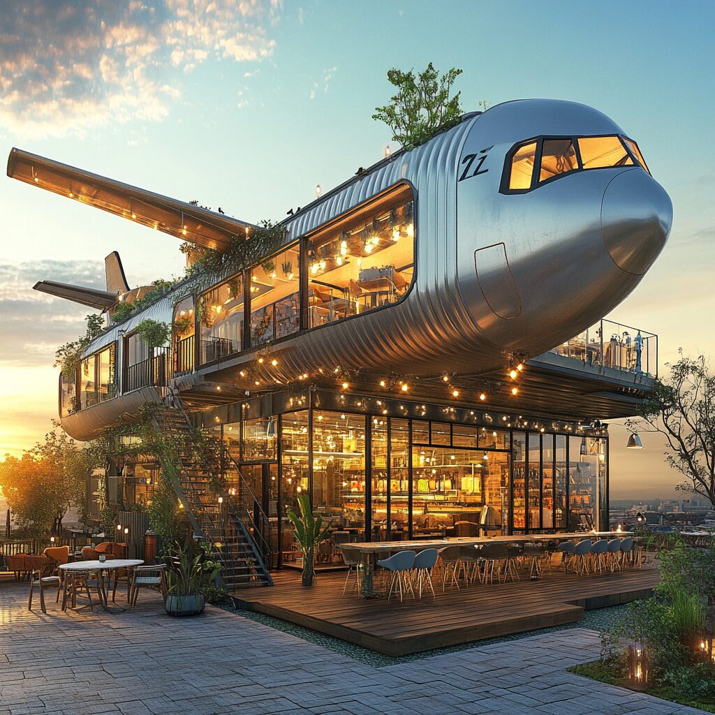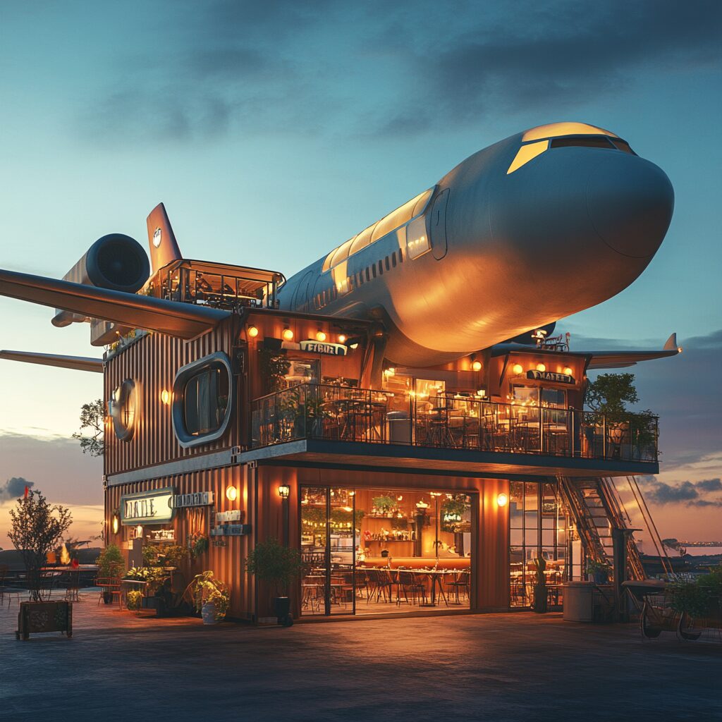create extra realisctic airplane restaurant structured on a double floor container cafe & retails with an atmosphere of shopping under a clear sky at sunset --v 6.1