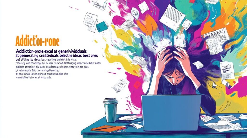依存症になりやすい性格は、衝動性やリスクを冒す傾向があり、これらは創造性と密接に関連しています。こうした特性は、豊富なアイデアを生み出す力の源泉となる一方で、そのアイデアを選び取り、実現する段階で障壁にもなり得ます。依存傾向がアイデアの創出と選択にどのように影響を与えるか、そのメカニズムはまだ完全には解明されていませんが、このような創造的なプロセスには適切なサポートが不可欠です。