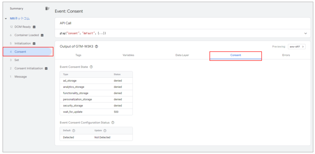 意図したタイミングで同意ステータスが更新されているかを確認する際は、GTMのデバッグ画面で「Consent」というイベントが発生しているかを確認します。同意を選択する前の段階で「Consent」が発生していない場合は、同意ステータスのデフォルト値を設定できていない可能性があるので、同意モードの実装についての公式ドキュメントを参考に設定を見直してください。