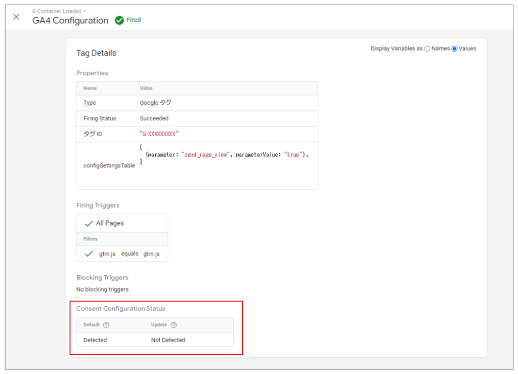 また、同意ステータスのデフォルト値が適切に設定されていると、Google タグ(旧:GA4 設定タグ)を開いて下の方にある「Event Consent Configuration Status」でDefaultが「Detected」となります。